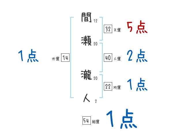 天運![]() | 間瀬瀧人さんの天運は32画の5つ星!柔軟性があり成功する。チャンスが多く金運が良い。 家系が持つ宿命的な運勢を表します。祖先から受け継いだ苗字ですので自分の力が及びません。家柄を象徴します。 |