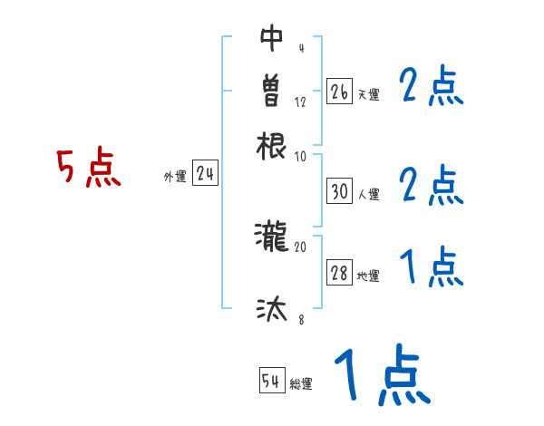外運![]() | 中曽根瀧汰さんの外運は24画の5つ星!家庭運が良く順調な人生。金運にも恵まれる。 生活面を象徴する運勢です。外部から受ける影響力を表し、結婚運、家庭運や職場、環境への順応性を表します。 |