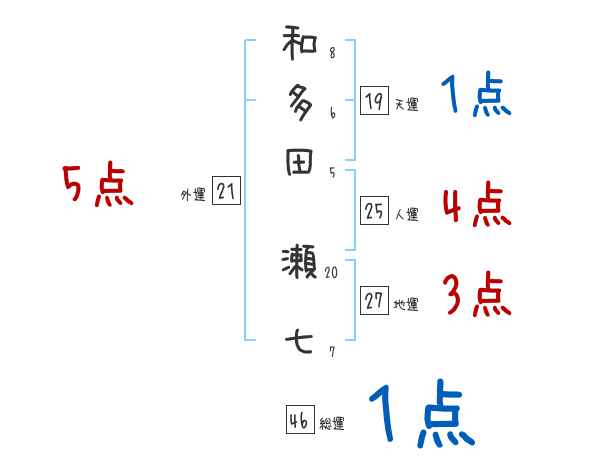 総運![]() | 和多田瀬七さんの総運は46画の1つ星!迷走することが多く苦労するかも。目先のことにとらわれないように。 あなたの人生を表す1番重要な運勢です。生涯を通じて影響する総合運となり、主に50歳以降の晩年期に影響を及ぼします。 |