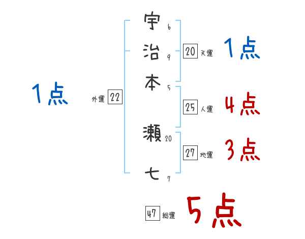 総運![]() | 宇治本瀬七さんの総運は47画の5つ星!実力が開花し発展する円満な人生。財に恵まれる。 あなたの人生を表す1番重要な運勢です。生涯を通じて影響する総合運となり、主に50歳以降の晩年期に影響を及ぼします。 |