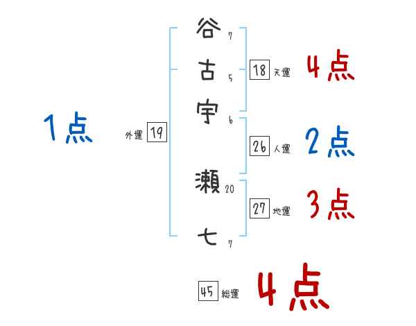 天運![]() | 谷古宇瀬七さんの天運は18画の4つ星!情熱的で剛気。忍耐力があり信頼される。 家系が持つ宿命的な運勢を表します。祖先から受け継いだ苗字ですので自分の力が及びません。家柄を象徴します。 |