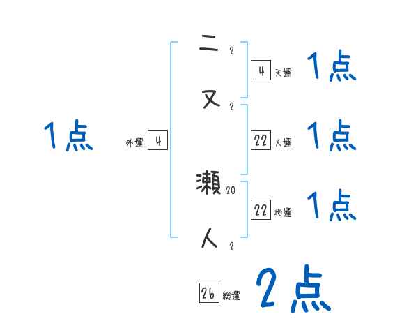 天運![]() | 二又瀬人さんの天運は4画の1つ星!感情が不安定で苦労するかも。周囲との協調を心掛けましょう。 家系が持つ宿命的な運勢を表します。祖先から受け継いだ苗字ですので自分の力が及びません。家柄を象徴します。 |