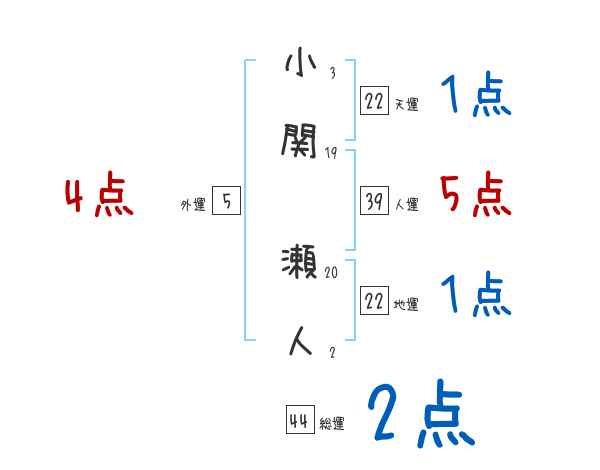 天運![]() | 小関瀬人さんの天運は22画の1つ星!努力することが苦手ないっぽう手先が器用。芸術性にも優れる。 家系が持つ宿命的な運勢を表します。祖先から受け継いだ苗字ですので自分の力が及びません。家柄を象徴します。 |