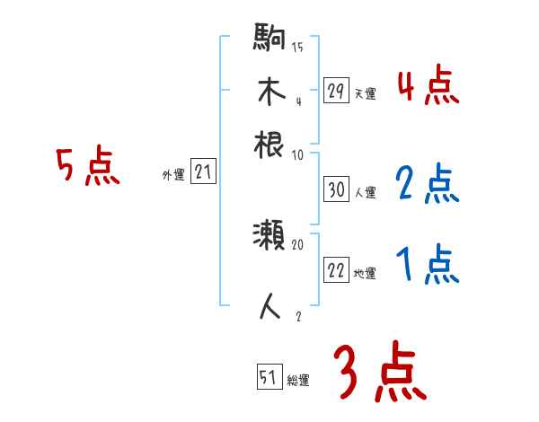 外運![]() | 駒木根瀬人さんの外運は21画の5つ星!統率力がある。独立し成功する。名誉を手に入れる。 生活面を象徴する運勢です。外部から受ける影響力を表し、結婚運、家庭運や職場、環境への順応性を表します。 |