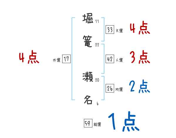 外運![]() | 堀篭瀬名さんの外運は17画の4つ星!積極的な行動力。地位を気づき財産を手に入れる。純粋な心と直感力。 生活面を象徴する運勢です。外部から受ける影響力を表し、結婚運、家庭運や職場、環境への順応性を表します。 |