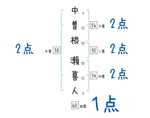 人運![]() | 中曽根瀬喜人さんの人運は30画の2つ星!浮き沈みの激しさに注意しましょう。 性格や才能などを表す2番目に重要な運勢です。人間関係や協調性、社会的な成功に影響します。主に20歳から50歳ぐらいまでの中年期の運勢を表します。 |
