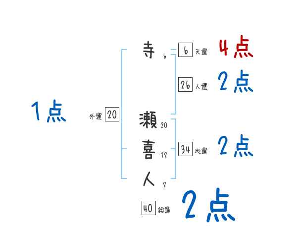 天運![]() | 寺瀬喜人さんの天運は6画の4つ星!慎重な努力家で信頼を得る。誠実な精神で向上心に優れる。 家系が持つ宿命的な運勢を表します。祖先から受け継いだ苗字ですので自分の力が及びません。家柄を象徴します。 |