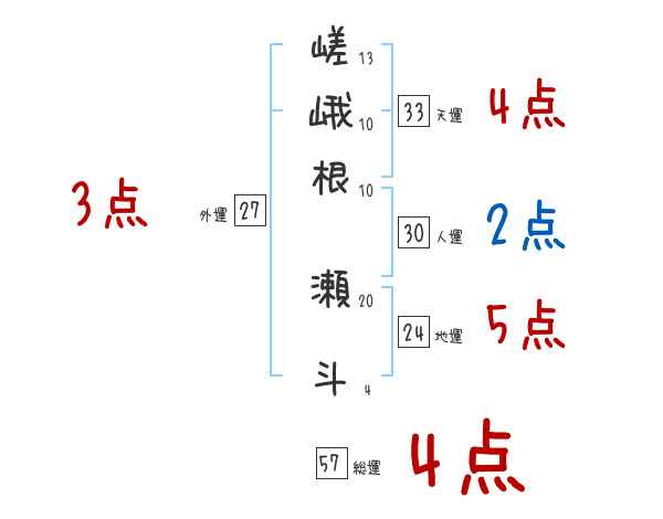 天運![]() | 嵯峨根瀬斗さんの天運は33画の4つ星!権力志向でプライドが高い。勇気があり運を切り開き成功する。 家系が持つ宿命的な運勢を表します。祖先から受け継いだ苗字ですので自分の力が及びません。家柄を象徴します。 |