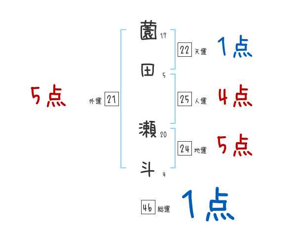 外運![]() | 薗田瀬斗さんの外運は21画の5つ星!統率力がある。独立し成功する。名誉を手に入れる。 生活面を象徴する運勢です。外部から受ける影響力を表し、結婚運、家庭運や職場、環境への順応性を表します。 |