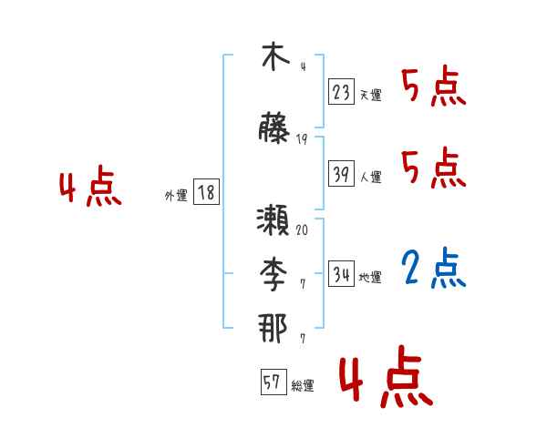 天運![]() | 木藤瀬李那さんの天運は23画の5つ星!想像力に優れ活力がある。一代で成功し名誉を手に入れる。 家系が持つ宿命的な運勢を表します。祖先から受け継いだ苗字ですので自分の力が及びません。家柄を象徴します。 |