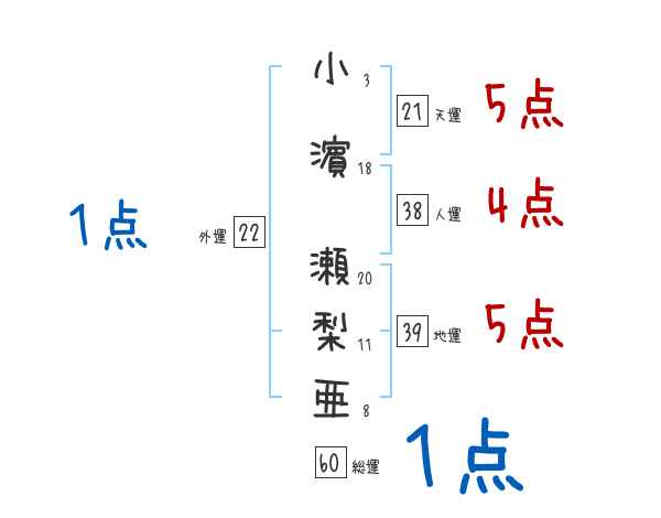 天運![]() | 小濵瀬梨亜さんの天運は21画の5つ星!統率力がある。独立し成功する。名誉を手に入れる。 家系が持つ宿命的な運勢を表します。祖先から受け継いだ苗字ですので自分の力が及びません。家柄を象徴します。 |
