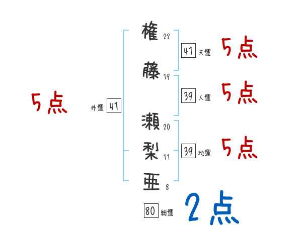 総運![]() | 権藤瀬梨亜さんの総運は80画の2つ星!病弱で健康に注意。多少苦労することがあるかも。 あなたの人生を表す1番重要な運勢です。生涯を通じて影響する総合運となり、主に50歳以降の晩年期に影響を及ぼします。 |
