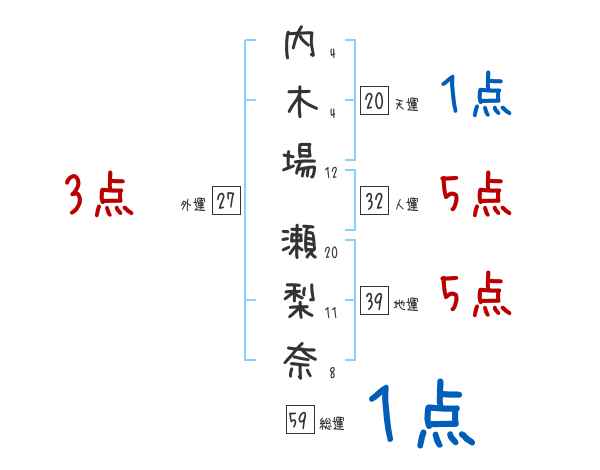 人運![]() | 内木場瀬梨奈さんの人運は32画の5つ星!柔軟性があり成功する。チャンスが多く金運が良い。 性格や才能などを表す2番目に重要な運勢です。人間関係や協調性、社会的な成功に影響します。主に20歳から50歳ぐらいまでの中年期の運勢を表します。 |