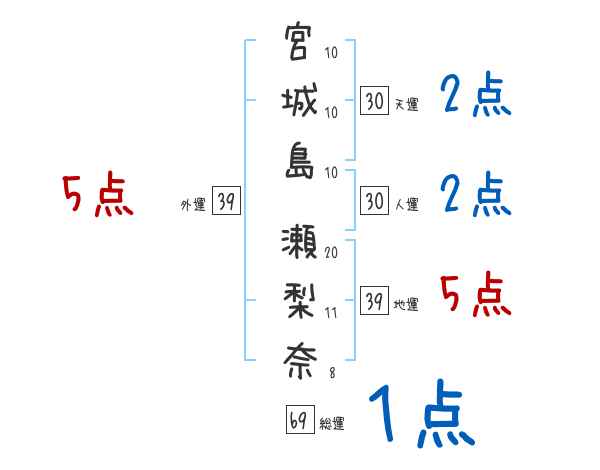外運![]() | 宮城島瀬梨奈さんの外運は39画の5つ星!社交性に優れ人望が厚い。人の上に立ち成功する。 生活面を象徴する運勢です。外部から受ける影響力を表し、結婚運、家庭運や職場、環境への順応性を表します。 |