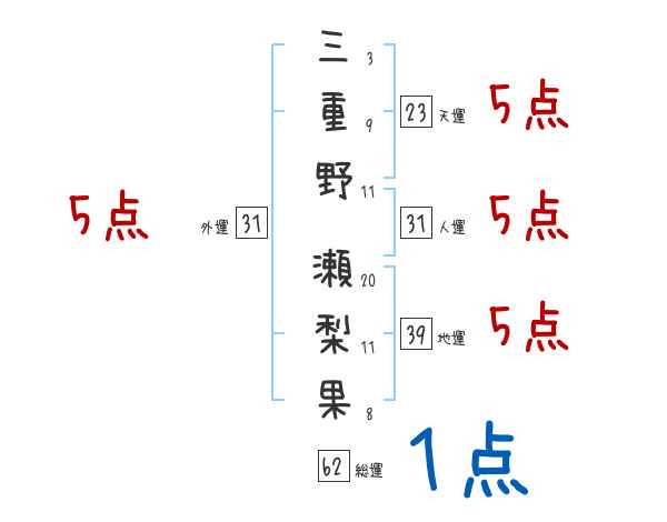 外運![]() | 三重野瀬梨果さんの外運は31画の5つ星!社交性があり判断力に優れる。順風満帆な人生で円満な生活。 生活面を象徴する運勢です。外部から受ける影響力を表し、結婚運、家庭運や職場、環境への順応性を表します。 |