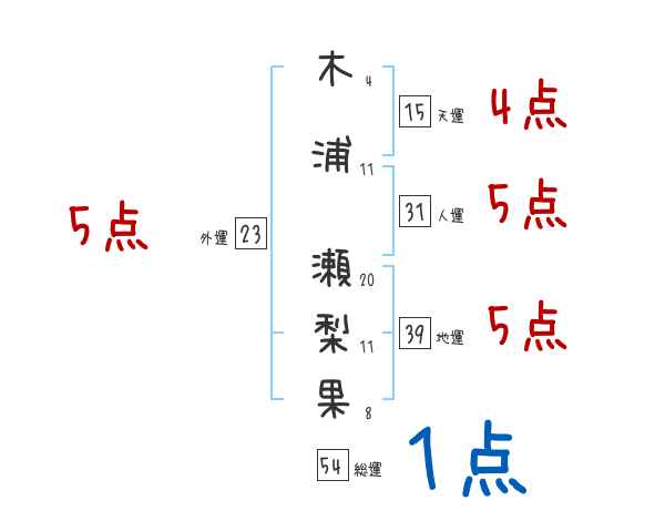外運![]() | 木浦瀬梨果さんの外運は23画の5つ星!想像力に優れ活力がある。一代で成功し名誉を手に入れる。 生活面を象徴する運勢です。外部から受ける影響力を表し、結婚運、家庭運や職場、環境への順応性を表します。 |
