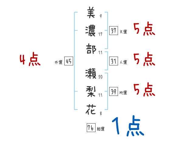 総運![]() | 美濃部瀬梨花さんの総運は76画の1つ星!離散に注意。劣等感を感じ孤立しやすい傾向があるかも。 あなたの人生を表す1番重要な運勢です。生涯を通じて影響する総合運となり、主に50歳以降の晩年期に影響を及ぼします。 |