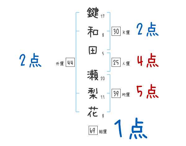 天運![]() | 鍵和田瀬梨花さんの天運は30画の2つ星!浮き沈みの激しさに注意しましょう。 家系が持つ宿命的な運勢を表します。祖先から受け継いだ苗字ですので自分の力が及びません。家柄を象徴します。 |