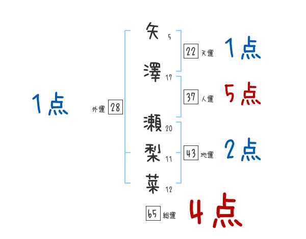| 外運  | 矢澤瀬梨菜さんの外運は28画の1つ星!家庭環境に注意。スポーツで活躍できる能力があるかも。生活面を象徴する運勢です。外部から受ける影響力を表し、結婚運、家庭運や職場、環境への順応性を表します。 |