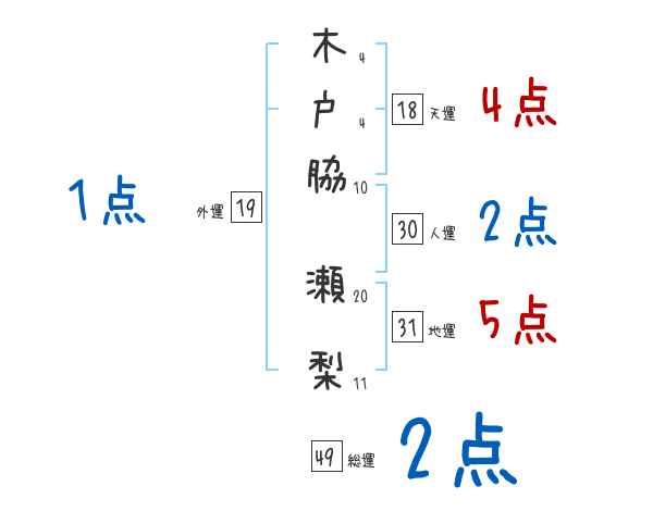 天運![]() | 木戸脇瀬梨さんの天運は18画の4つ星!情熱的で剛気。忍耐力があり信頼される。 家系が持つ宿命的な運勢を表します。祖先から受け継いだ苗字ですので自分の力が及びません。家柄を象徴します。 |
