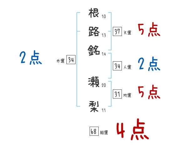 総運![]() | 根路銘瀬梨さんの総運は68画の4つ星!潜在能力が高く集中力が高い。勤勉に励み発展する。 あなたの人生を表す1番重要な運勢です。生涯を通じて影響する総合運となり、主に50歳以降の晩年期に影響を及ぼします。 |