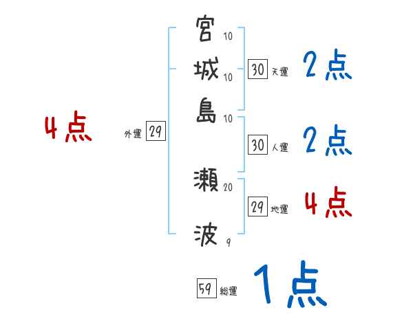 天運![]() | 宮城島瀬波さんの天運は30画の2つ星!浮き沈みの激しさに注意しましょう。 家系が持つ宿命的な運勢を表します。祖先から受け継いだ苗字ですので自分の力が及びません。家柄を象徴します。 |
