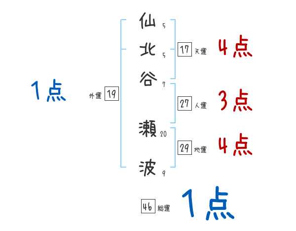 天運![]() | 仙北谷瀬波さんの天運は17画の4つ星!積極的な行動力。地位を気づき財産を手に入れる。純粋な心と直感力。 家系が持つ宿命的な運勢を表します。祖先から受け継いだ苗字ですので自分の力が及びません。家柄を象徴します。 |