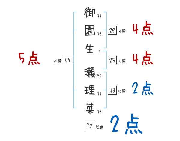 外運![]() | 御園生瀬理菜さんの外運は47画の5つ星!実力が開花し発展する円満な人生。財に恵まれる。 生活面を象徴する運勢です。外部から受ける影響力を表し、結婚運、家庭運や職場、環境への順応性を表します。 |