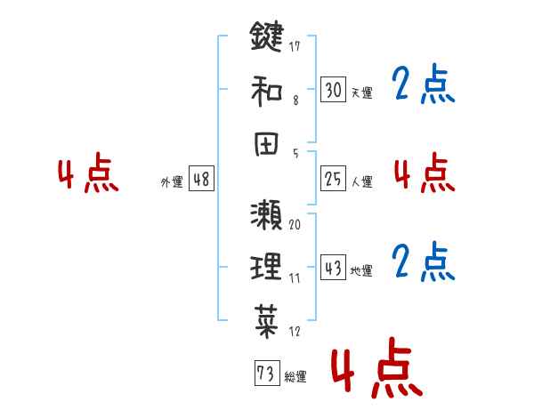 外運![]() | 鍵和田瀬理菜さんの外運は48画の4つ星!賢明な性格で人望が厚い。指導力があり多くの人に尊敬される。 生活面を象徴する運勢です。外部から受ける影響力を表し、結婚運、家庭運や職場、環境への順応性を表します。 |