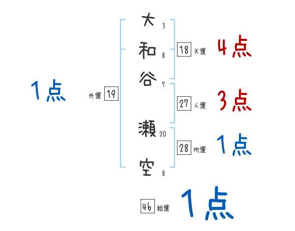 天運![]() | 大和谷瀬空さんの天運は18画の4つ星!情熱的で剛気。忍耐力があり信頼される。 家系が持つ宿命的な運勢を表します。祖先から受け継いだ苗字ですので自分の力が及びません。家柄を象徴します。 |