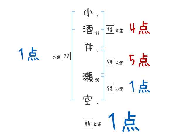 天運![]() | 小酒井瀬空さんの天運は18画の4つ星!情熱的で剛気。忍耐力があり信頼される。 家系が持つ宿命的な運勢を表します。祖先から受け継いだ苗字ですので自分の力が及びません。家柄を象徴します。 |