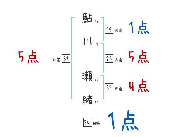 人運![]() | 鮎川瀬緒さんの人運は23画の5つ星!想像力に優れ活力がある。一代で成功し名誉を手に入れる。 性格や才能などを表す2番目に重要な運勢です。人間関係や協調性、社会的な成功に影響します。主に20歳から50歳ぐらいまでの中年期の運勢を表します。 |