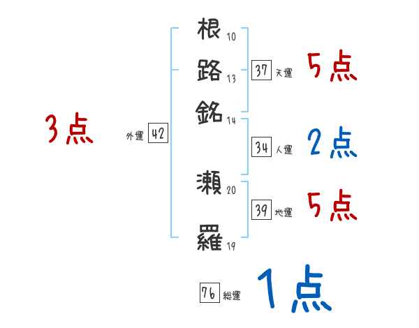 地運![]() | 根路銘瀬羅さんの地運は39画の5つ星!社交性に優れ人望が厚い。人の上に立ち成功する。 個性を表す基礎的な運勢です。性格形成や対人関係、行動力など家庭環境に影響されます。主に誕生してから20歳くらいまでの若年期の運勢を表します。 |