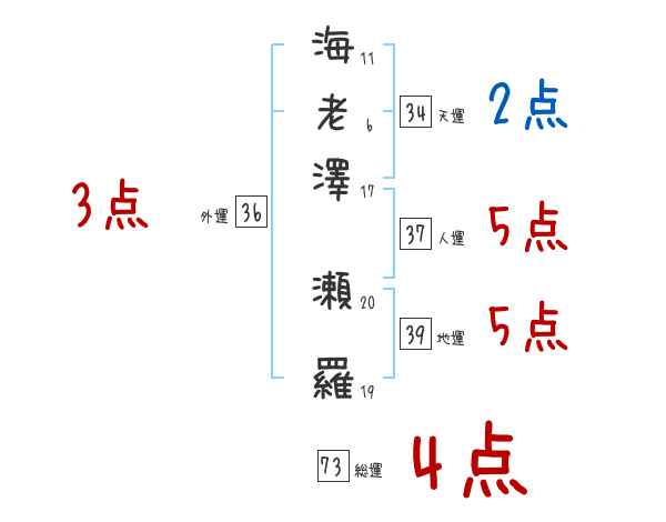 外運![]() | 海老澤瀬羅さんの外運は36画の3つ星!先見性が豊かです。多少神経質で苦労することも。 生活面を象徴する運勢です。外部から受ける影響力を表し、結婚運、家庭運や職場、環境への順応性を表します。 |