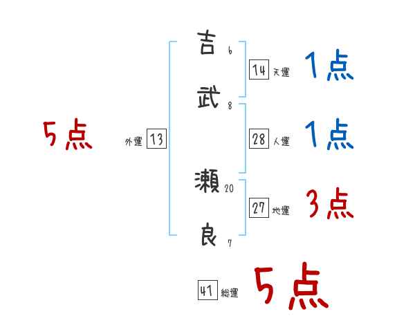 外運![]() | 吉武瀬良さんの外運は13画の5つ星!才能に恵まれ人気がある。名声を手に入れる。円満な人生。 生活面を象徴する運勢です。外部から受ける影響力を表し、結婚運、家庭運や職場、環境への順応性を表します。 |