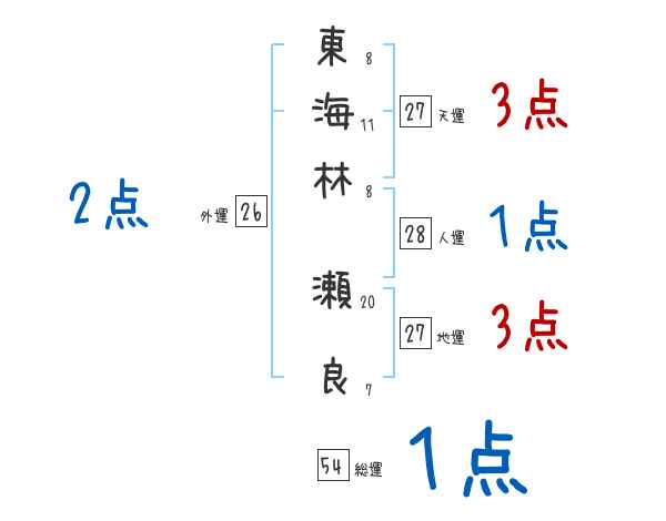 人運![]() | 東海林瀬良さんの人運は28画の1つ星!家庭環境に注意。スポーツで活躍できる能力があるかも。 性格や才能などを表す2番目に重要な運勢です。人間関係や協調性、社会的な成功に影響します。主に20歳から50歳ぐらいまでの中年期の運勢を表します。 |