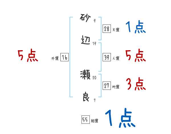 外運![]() | 砂辺瀬良さんの外運は16画の5つ星!人望が厚く大きく発展する。逆転成功が見える。 生活面を象徴する運勢です。外部から受ける影響力を表し、結婚運、家庭運や職場、環境への順応性を表します。 |