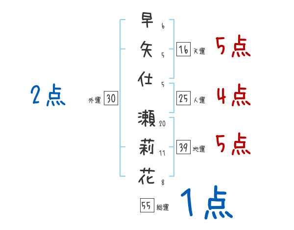 天運![]() | 早矢仕瀬莉花さんの天運は16画の5つ星!人望が厚く大きく発展する。逆転成功が見える。 家系が持つ宿命的な運勢を表します。祖先から受け継いだ苗字ですので自分の力が及びません。家柄を象徴します。 |