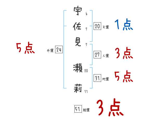 外運![]() | 宇佐見瀬莉さんの外運は24画の5つ星!家庭運が良く順調な人生。金運にも恵まれる。 生活面を象徴する運勢です。外部から受ける影響力を表し、結婚運、家庭運や職場、環境への順応性を表します。 |