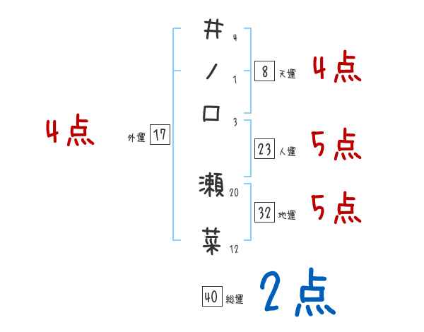 外運![]() | 井ノ口瀬菜さんの外運は17画の4つ星!積極的な行動力。地位を気づき財産を手に入れる。純粋な心と直感力。 生活面を象徴する運勢です。外部から受ける影響力を表し、結婚運、家庭運や職場、環境への順応性を表します。 |