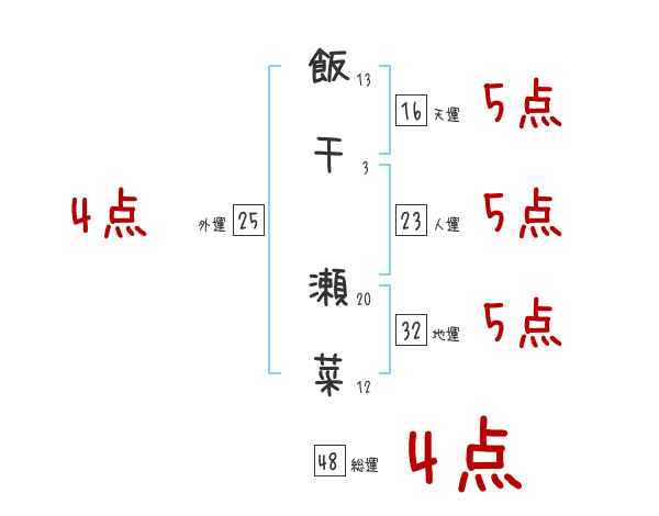 地運![]() | 飯干瀬菜さんの地運は32画の5つ星!柔軟性があり成功する。チャンスが多く金運が良い。 個性を表す基礎的な運勢です。性格形成や対人関係、行動力など家庭環境に影響されます。主に誕生してから20歳くらいまでの若年期の運勢を表します。 |