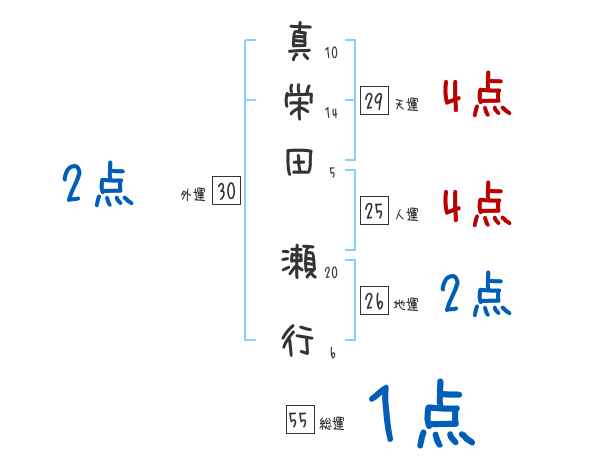 天運![]() | 真栄田瀬行さんの天運は29画の4つ星!完全主義で才能がある。厳格な心の持ち主。 家系が持つ宿命的な運勢を表します。祖先から受け継いだ苗字ですので自分の力が及びません。家柄を象徴します。 |