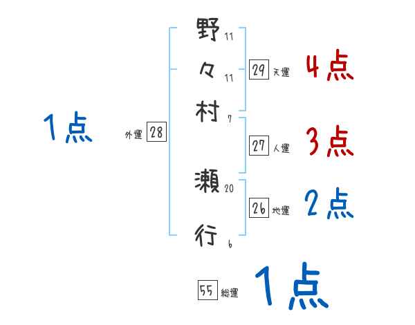 天運![]() | 野々村瀬行さんの天運は29画の4つ星!完全主義で才能がある。厳格な心の持ち主。 家系が持つ宿命的な運勢を表します。祖先から受け継いだ苗字ですので自分の力が及びません。家柄を象徴します。 |