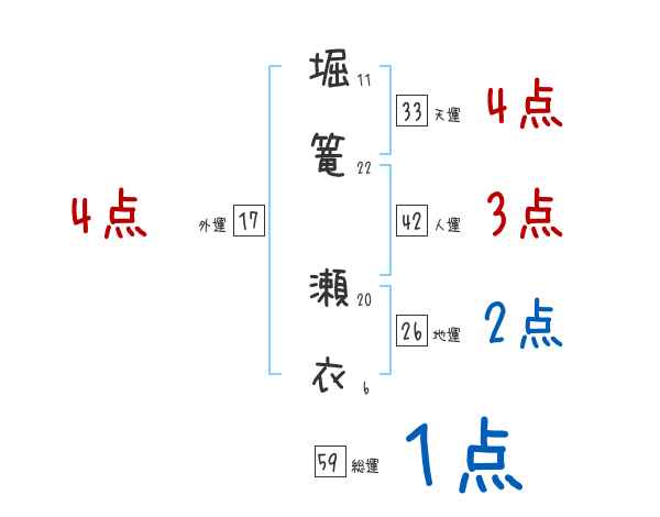 天運![]() | 堀篭瀬衣さんの天運は33画の4つ星!権力志向でプライドが高い。勇気があり運を切り開き成功する。 家系が持つ宿命的な運勢を表します。祖先から受け継いだ苗字ですので自分の力が及びません。家柄を象徴します。 |
