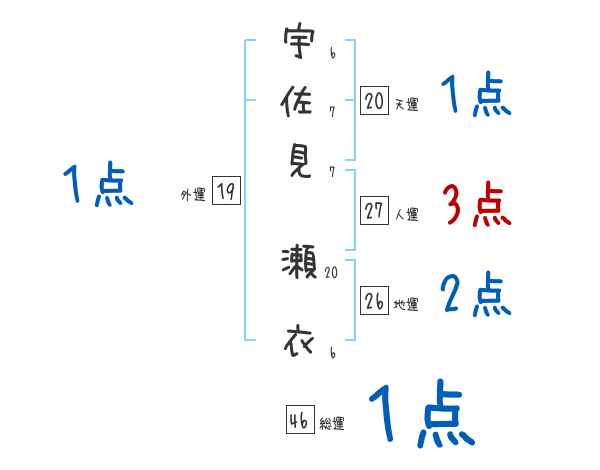 総運![]() | 宇佐見瀬衣さんの総運は46画の1つ星!迷走することが多く苦労するかも。目先のことにとらわれないように。 あなたの人生を表す1番重要な運勢です。生涯を通じて影響する総合運となり、主に50歳以降の晩年期に影響を及ぼします。 |