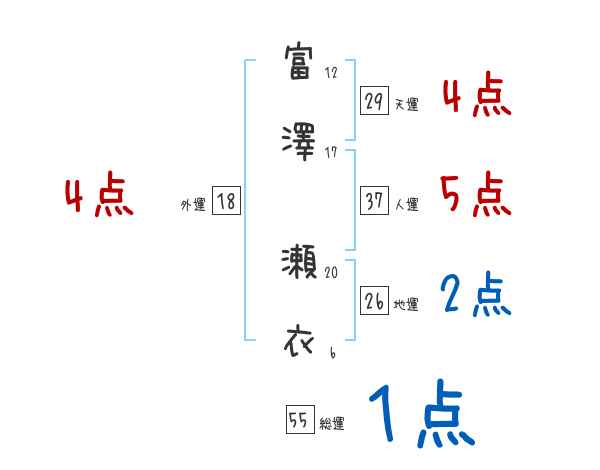 天運![]() | 富澤瀬衣さんの天運は29画の4つ星!完全主義で才能がある。厳格な心の持ち主。 家系が持つ宿命的な運勢を表します。祖先から受け継いだ苗字ですので自分の力が及びません。家柄を象徴します。 |