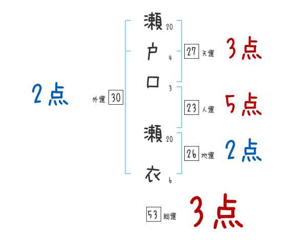 天運![]()  | 瀬戸口瀬衣さんの天運は27画の3つ星!頭脳明晰だが強情で摩擦が多い傾向。孤立に注意。 家系が持つ宿命的な運勢を表します。祖先から受け継いだ苗字ですので自分の力が及びません。家柄を象徴します。 |