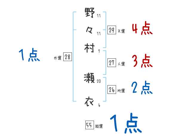 天運![]() | 野々村瀬衣さんの天運は29画の4つ星!完全主義で才能がある。厳格な心の持ち主。 家系が持つ宿命的な運勢を表します。祖先から受け継いだ苗字ですので自分の力が及びません。家柄を象徴します。 |