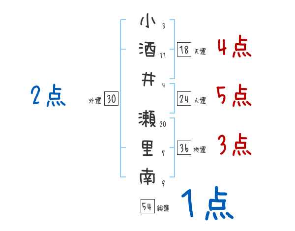 総運![]() | 小酒井瀬里南さんの総運は54画の1つ星!トラブルが多いかも。周りをよく見て協調して過ごしましょう。 あなたの人生を表す1番重要な運勢です。生涯を通じて影響する総合運となり、主に50歳以降の晩年期に影響を及ぼします。 |