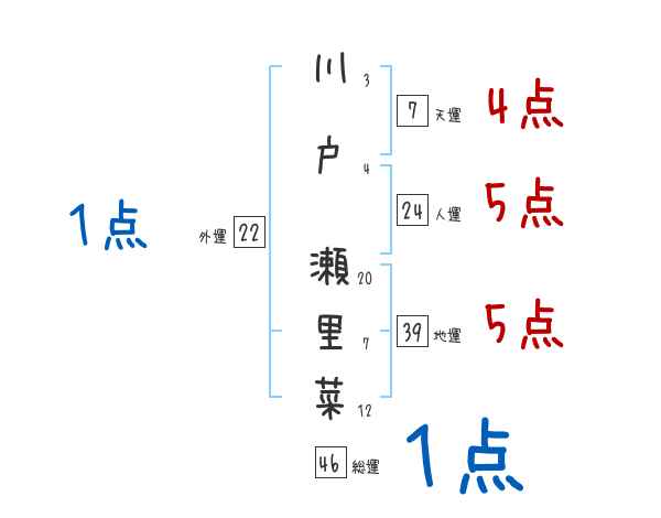 外運![]() | 川戸瀬里菜さんの外運は22画の1つ星!努力することが苦手ないっぽう手先が器用。芸術性にも優れる。 生活面を象徴する運勢です。外部から受ける影響力を表し、結婚運、家庭運や職場、環境への順応性を表します。 |